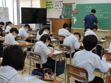 6月19日(月)1年生「授業の様子」 公開日 2023/06/19 更新日 2023/06/19 1年生 2時間目の様子です。 (写真上)家庭科「SDG'sと生鮮食品」 (写真中)保体「調和のとれた生活」 (写真下)理科「密度を計算で求めよう」