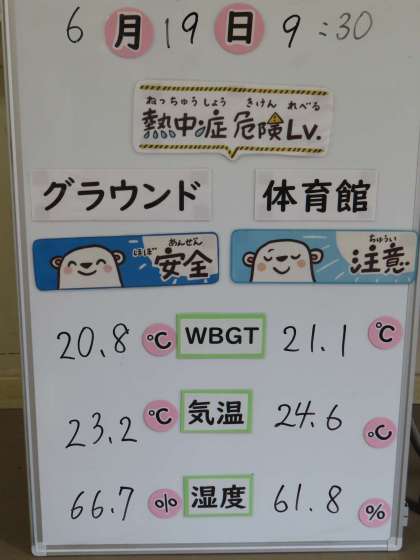 6月19日(月)「職員室前に」 公開日 2023/06/19 更新日 2023/06/19 学校生活 暑い季節になりました。 これから危惧されるのは「熱中症」です。 毎日、養護教諭が定期的に気温やWBGT、湿度を測定して、運動の適否を示しています。