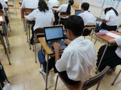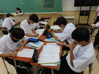 6月22日(木)「6時間目のあとにも・・・」その2 公開日 2023/06/22 更新日 2023/06/22 学校生活 今日の2年生は、どこも自分の教室で学習しているようです。 クロムブックで文化委員会作成の問題に取り組んでいる生徒、 数学の問題のアドバイスを受けている生徒、 こちらはグループになって勉強しています。数学、英語、社会科と、それぞれの勉強に取り組んでいます。