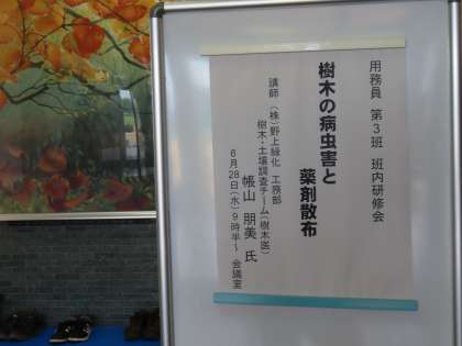 近隣の学校の用務員さんたちが集まり、樹木の害虫対策について、専門家からお話をききました。