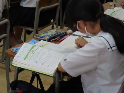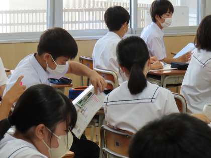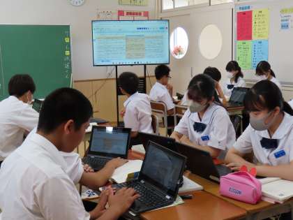 7月6日(木)2年生「授業の様子」 公開日 2023/07/06 更新日 2023/07/06 2年生 1時間目の様子です。 (写真上)1組英語「何のためにコンピュータを使うのか読み取ろう」 (写真中)2組数学「1次関数の性質を調べよう」 (写真下)3組国語「『エビフライ』に込められた心情を読み取ろう」