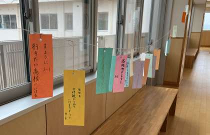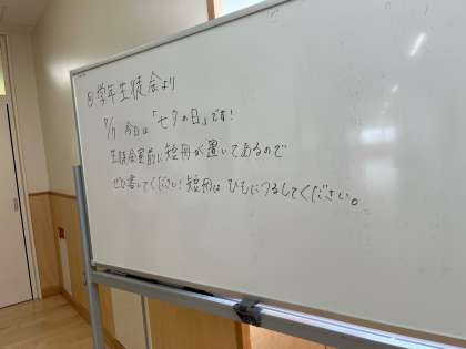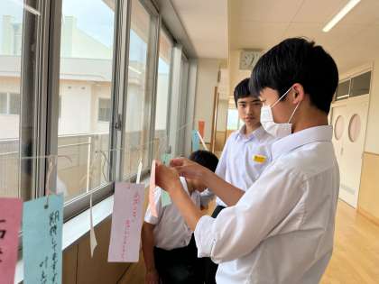 7月7日(金)3年生「今日は何の日?」 公開日 2023/07/07 更新日 2023/07/07 3年生 今日は七夕ということで、学年廊下で短冊を書いて飾っている様子が見られました。 明日から県選を控えている生徒も多いので、県選の勝利を願う短冊、進路に向けた短冊など、たくさんの生徒の思いが込められていました。
