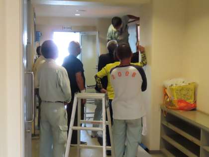 7月19日(水)「用務員班内研修会」 公開日 2023/07/19 更新日 2023/07/19 学校生活 本校に近隣の学校の用務員さんたちが集まり、ドアのメンテナンスについて研修しました。 体育館の重い扉がスムーズに動くようになりました。