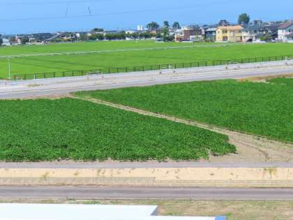 7月21日(金)「田園風景」 公開日 2023/07/21 更新日 2023/07/21 学校生活 学校の北側には、手前に畑が、向こうに田んぼが広がっています。 そのずっと向こうは海です。 緑が美しいです。