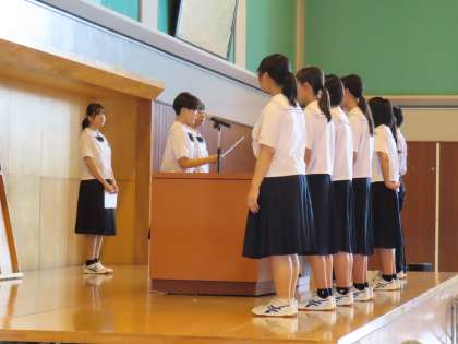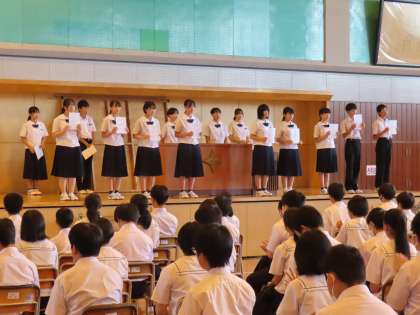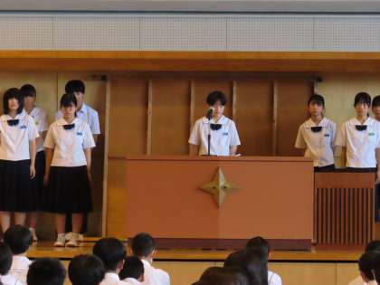 9月4日(月)生徒会活動「生徒会役員認証式・委嘱式」 公開日 2023/09/04 更新日 2023/09/04 学校生活 専門委員長は、生徒会長が委嘱します。 (写真上)委嘱状の授与。 (写真中)委嘱を受けた専門委員長たち。 (写真下)後期生徒会長の挨拶。
