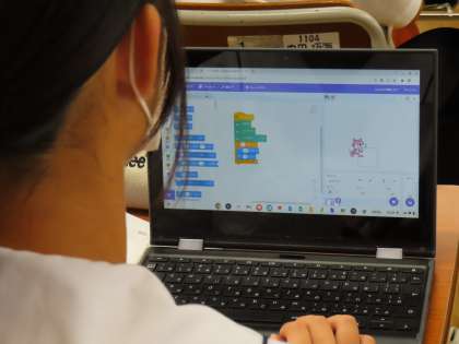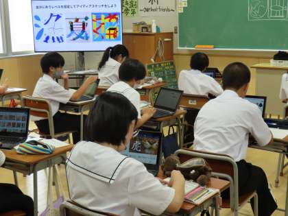 9月5日(火)1年生「授業の様子」 公開日 2023/09/05 更新日 2023/09/05 1年生 3時間目の様子です。 (写真上)1組技術「スクラッチをつかって多角形を描けるようになろう」 (写真中)2組英語「場所の言い方を復習しよう」 (写真下)3組美術「自分に合ったレベルを設定してアイデアスケッチをしよう」