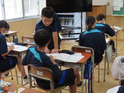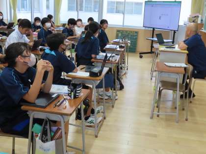 9月19日(火)1年生「授業の様子」 公開日 2023/09/19 更新日 2023/09/19 1年生 3時間目の様子です。 (写真上)1組数学「方程式を利用して考えよう」 (写真中)2組英語「その人になったつもりでケヴィン先生に体験を話そう」 (写真下)3組技術「スクラッチでクイズをつくろう」
