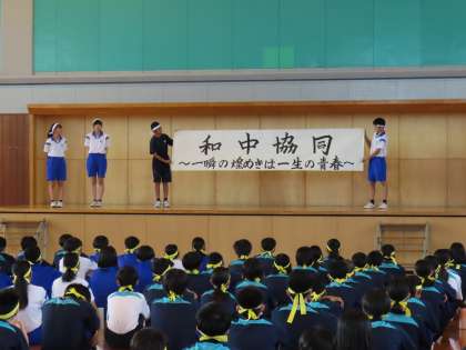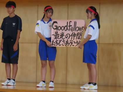 9月19日(火)「運動会結団式」 公開日 2023/09/19 更新日 2023/09/19 学校生活 いよいよ今週から運動会のための練習が始まります。 5時間目に行った結団式の様子をお伝えします。 (写真上)信条の朗読 (写真中)スローガン発表 (写真下)団目標の発表※旭光団