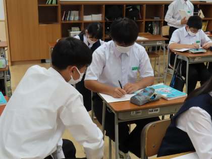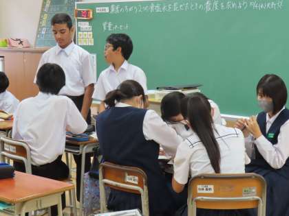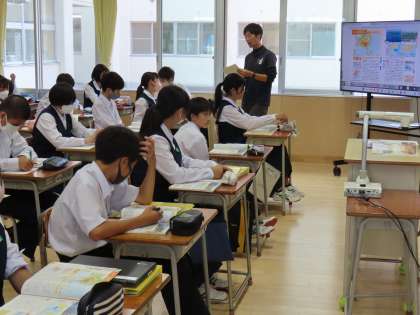 10月4日(水)1年生「授業の様子」 公開日 2023/10/04 更新日 2023/10/04 1年生 2時間目の様子です。 (写真上)1組理科「濃度のちがう2つの食塩水を混ぜ合わせたときの濃度を求めよう」 (写真中)2組数学「比例式を使って解こう」 (写真下)3組社会「アジア州の自然環境の特徴は?」