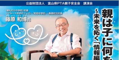 ★県PTA親子安全会講演会のお知らせ 公開日 2023/10/26 更新日 2023/10/26 PTA活動 今年はなんと、藤原和博氏の講演です。 詳細は下のリンク先を参照ください。 リンク:県PTA親子安全会講演会