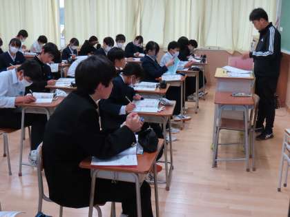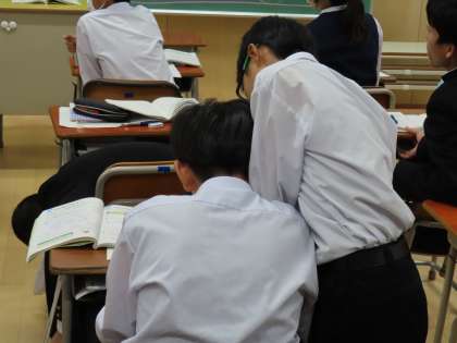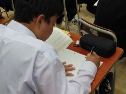11月7日(火)2年生「授業の様子」 公開日 2023/11/07 更新日 2023/11/07 2年生 5時間目の授業は・・・ (写真上)1組数学「2つの三角形が合同かどうかを判断する方法を考えよう」 (写真中)2組保体「出血があるときの応急手当」 (写真下)3組国語「情景を想像しながら視写しよう」