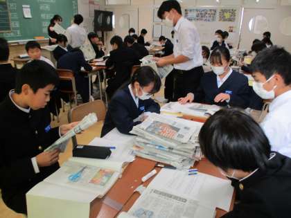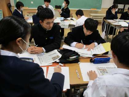 先週の続きで、新聞から記事を切り取り、今後追究していく課題を考えました。世界平和や環境問題、日本の政治経済から、身近な熊被害まで、様々な課題が出ました。