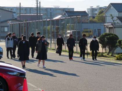 11月21日(火)「登校風景」 公開日 2023/11/21 更新日 2023/11/21 学校生活 おはようございます。 昨日とはうって変わって、まぶしい朝になりました。 雲一つない青空のもと、生徒が登校してきます。 今日もよろしくお願いします。