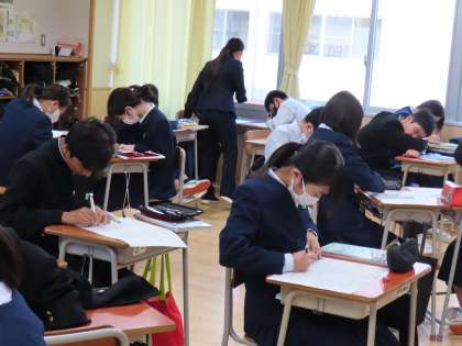 (写真中)2組理科「凸レンズを通る光の道筋から、できる像を考えよう」