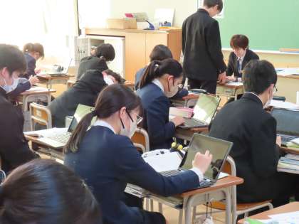 11月22日(水)3年生「授業の様子」 公開日 2023/11/22 更新日 2023/11/22 3年生 5時間目の授業は・・・ (写真上)1組自習「テストに向けて勉強しよう」 (写真中)2組社会「経済において、お金を賢く使うために大切なことは何だろう」 (写真下)3組音楽「能に親しみ、その音楽を味わおう」