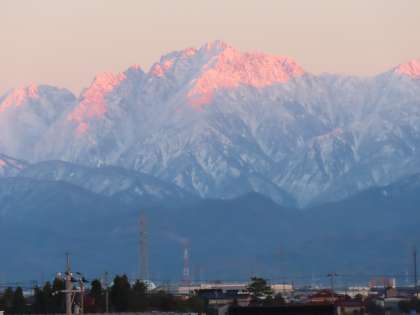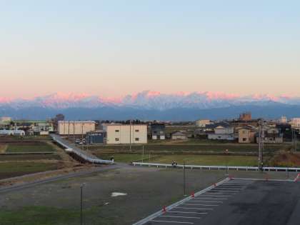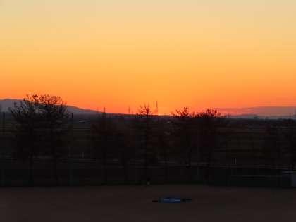 12月4日(月)「夕暮れ時」 公開日 2023/12/04 更新日 2023/12/04 学校生活 部活動が終わろうとする頃、西に広がる田園の向こうに太陽が沈んでオレンジ色の夕焼けが訪れました。 立山連峰も赤く染められていました。