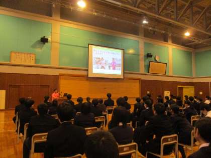 「人を大切にできる自分になるために 〜みんなでいじめと向き合おう〜 」と題し、富山法務少年支援センターの2名の法務教官に講演していただきました。生徒たちは、身近な問題として受け止め、真剣に聞いていました。