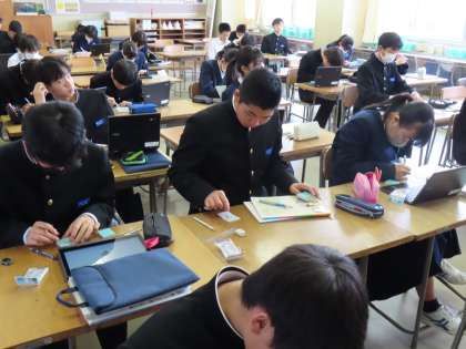 (写真上)1組数学「四角形にどんな条件が加わると平行四辺形になるか」