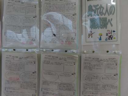 1月18日(木)1年生「身近な人の職業調べ」 公開日 2024/01/18 更新日 2024/01/18 1年生 1年生各教室の廊下には、各自が調べた「身近な人の職業調べ」が掲示されています。 「あなたの」身近な人と「私の」身近な人、同じ身近な人でもいろんな仕事に就いている、世の中はいろんな仕事が支えているのだ、ということが実感できる掲示です。 そして今は、これを調べた生徒たちの多くが「今ここには無い仕事」に就くのだ、と言われている時代です。