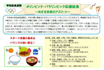 1月22(月)「今週は学校給食週間です」 公開日 2024/01/22 更新日 2024/01/22 学校生活 今回のテーマは「オリンピック・パラリンピック応援給食」 毎日テーマに沿った献立になっています。 今日は「集中力アップ献立」です。