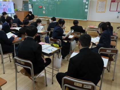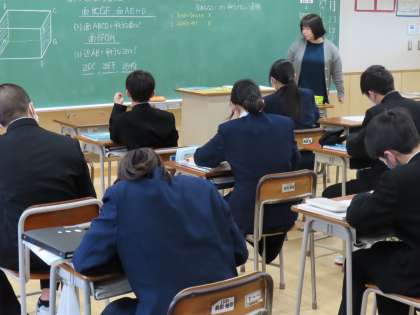 (写真下)3組数学「空間内の平面や直線の位置関係について考えよう」