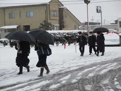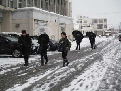 雪が降って、足下の悪い中、傘を差しながら生徒たちが登校してきました。