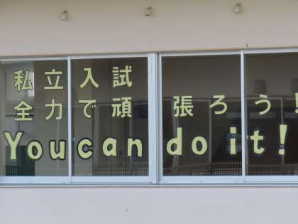 3年生の教室の反対側の廊下の窓には受検直前の応援メッセージが。