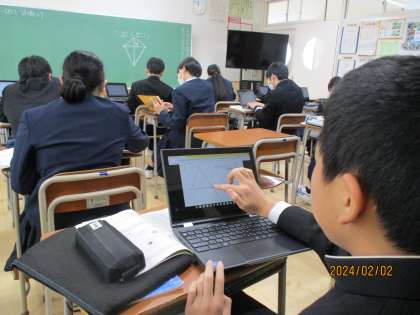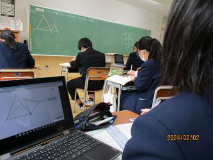 4限数学では、1点を共有する2つの正三角形で、条件を変えても成り立つ性質を見つけました。教科書のデジタルコンテンツを使って図形を動かし、各自のペースで考えています。