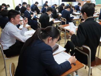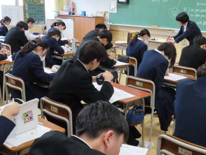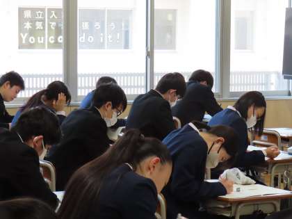2月14日(水)3年生「授業の様子」 公開日 2024/02/14 更新日 2024/02/14 3年生 1時間目の授業。 どのクラスも、まとめのプリントに取り組んでいます。 (写真上)1組社会 (写真中)2組英語 (写真下)3組数学 ※背景にもご注目!