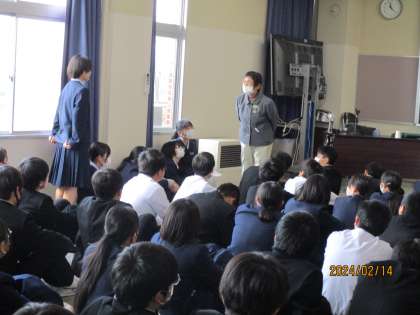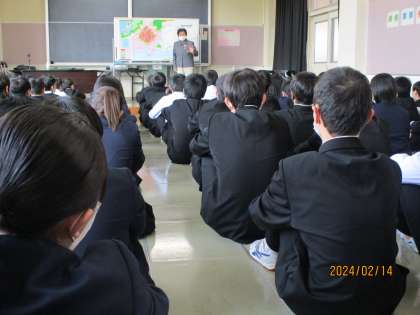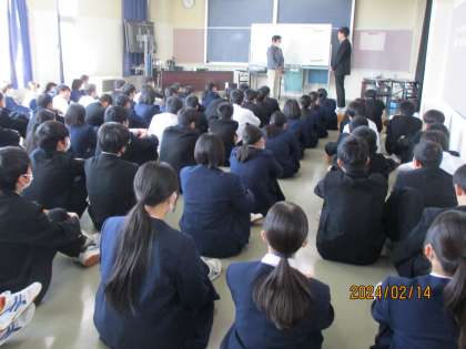 2月14日(水)2年生「被爆体験者講話」 公開日 2024/02/14 更新日 2024/02/14 2年生 遠く広島から、被爆者援護会理事長の石原智子さんを講師にお招きして、講話を聴きました。 戦時中のお話、原爆投下の日の様子、命の尊さ等、重いテーマを分かりやすくお話しされ、多くの学びを得ることができました。