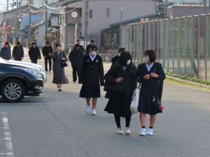 2月15日(木)「登校風景」 公開日 2024/02/15 更新日 2024/02/15 学校生活 おはようございます。 季節にしては暖かな朝になりました。 3年生は今日から学年末考査、進路懇談会です。 今日もよろしくお願いします。