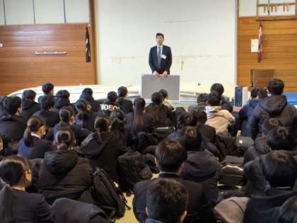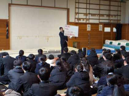 5限目に、明日から行われる県立一般入試の激励会を行い、校長から話をしました。