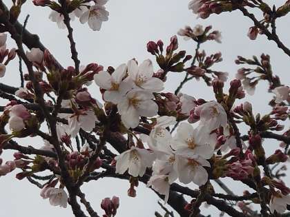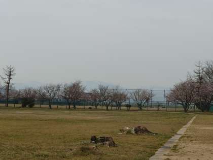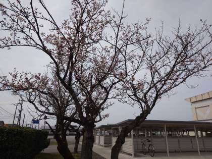 本校の桜もこの土日でずいぶん開花が進みました。 (写真上・中)駐輪場の横の桜の木 (写真下)グラウンドの向こう側も