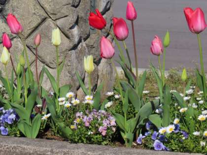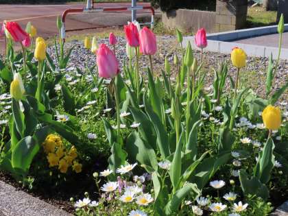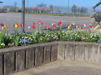校門横の小さな花壇のチューリップが、生徒たちを出迎えます。