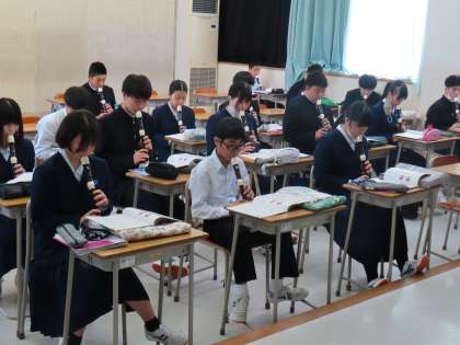 4月16日(火)3年生「授業の様子」 公開日 2024/04/16 更新日 2024/04/17 3年生 3時間目の様子です。 (写真上)1組音楽「『虹の彼方に』を演奏しよう」 (写真中)2組理科「水溶液と電流」 (写真下)3組数学「式の展開」