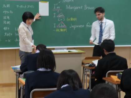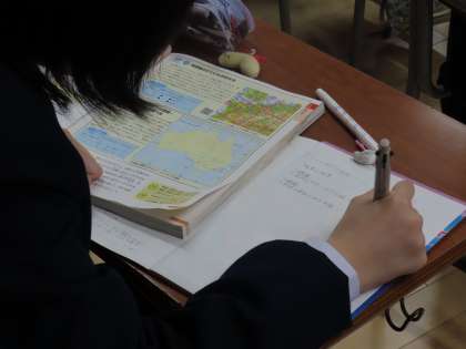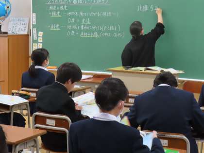 (写真上)1組社会「2つの地点の最短ルートを知ろう」