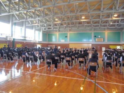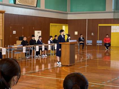 5月2日(木)生徒会活動「前期生徒総会」その1 公開日 2024/05/04 更新日 2024/05/07 学校生活 前期生徒総会を行いました。 執行部、学年生徒会、専門委員会からの前期活動計画案の説明の後、質疑応答を経て、全ての案について承認されました。 自分たちでつくり上げていく生徒会活動が、本格的にスタートします。 (写真上)信条朗読 (写真中)集会担当・浄書担当の紹介 (写真下)生徒会長挨拶