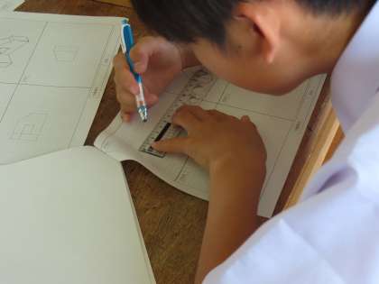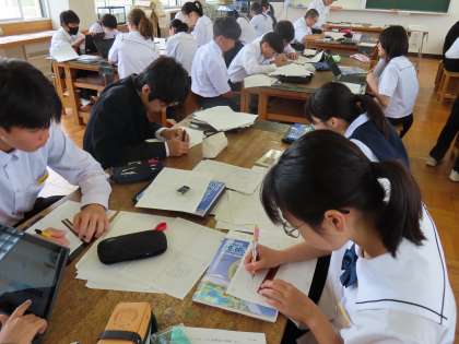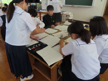 6月7日(金)1年生「授業の様子」 公開日 2024/06/07 更新日 2024/06/07 1年生 1時間目の1組は技術。 学習課題は「等角図と投影図を書き換えよう」です。 投影図で示された10個の部品を、平面図、側面図、正面図でそれぞれ表しています。 視点を変えながらマス目に合わせて、丁寧に描かなければいけません。 男女の別なく教え合う姿がありました。