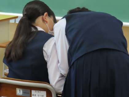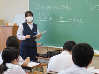 6月11日(火)3年生「授業の様子」 公開日 2024/06/11 更新日 2024/06/11 3年生 1組の6時間目は数学。 学習課題は「根号を含む式の計算をしよう」です。 みんなで根号を含む式の計算を確認しながら解いたあと、応用問題にチャレンジしました。 みんなにわかるように説明できてこそ、真の理解です。