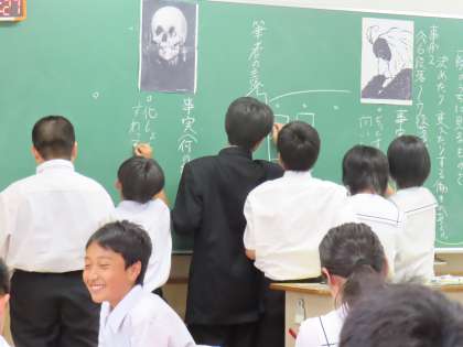 漢字テストで始まったこの時間の学習課題は「筆者の主張と事例との関係を捉えよう」です。