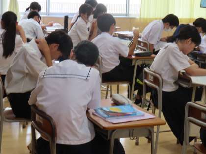 (写真下)3組英語「ALTに『14歳の挑戦』の報告書を作成しよう」