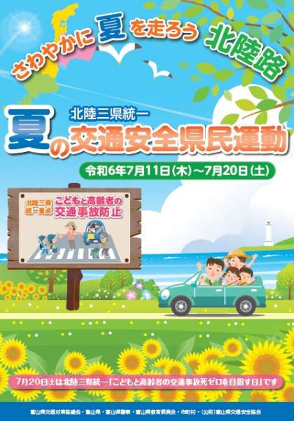 ★「夏の交通安全県民運動」実施中! 公開日 2024/07/12 更新日 2024/07/16 お知らせ 7月11日(木)〜7月20日(土)は「夏の交通安全県民運動」が展開されています。 日頃の交通安全意識や行動を見つめ直し、安全な交通に心がけましょう。
