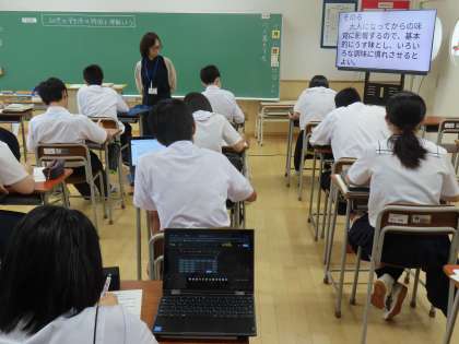 7月12日(金)3年生「授業の様子」 公開日 2024/07/12 更新日 2024/07/12 3年生 3時間目の様子です。 (写真上)1組英語「1学期の振り返りをうまく相手に伝えよう」d (写真中)2組総合的な学習の時間 (写真下)3組家庭「幼児の食生活の特徴を理解しよう」