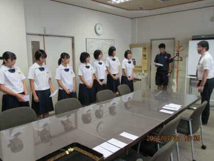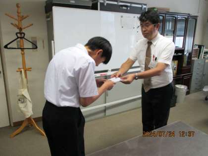 7月24日(水)「激励費支給」 公開日 2024/07/24 更新日 2024/07/25 学校生活 今年もたくさんの生徒が北信越大会や全国大会に出場します。 本校PTAや和合地区教育後援会からの激励費の支給を受け、それぞれの生徒たちは一層気持ちを高め、意気込みを伝えてくれました。 保護者のみなさんや地域の方々の応援を受け、それぞれの大会に臨みます。