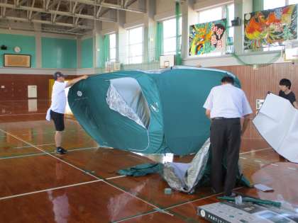 8月23日(金)「第二次避難所開設訓練」 公開日 2024/08/23 更新日 2024/08/24 学校生活 富山市の職員の方と避難所開設訓練を行いました。富山市の防災危機管理課の方の指導を受けながら、建物の外観確認、建物内の確認を行った後、実際の手順に従って、受付を設置したり、テントを設置したりしました。