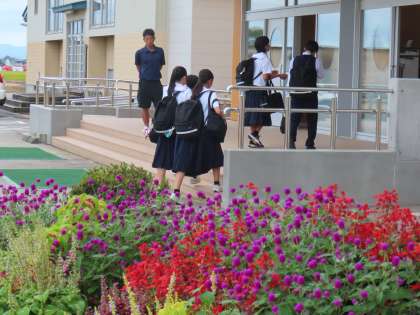9月9日(月)「登校風景」 公開日 2024/09/09 更新日 2024/09/10 学校生活 おはようございます。 新しい週の始まりです。 昨日の雨で花壇の花もホッと一息。うるおったようです。 今週から運動会の練習が始まります。 今週もよろしくお願いします。