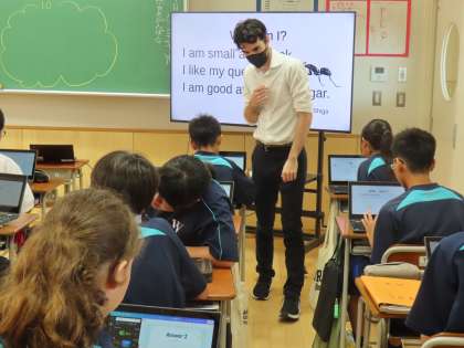 (写真上)1組英語「Let's make 3 hint quiz and enjoy it!」