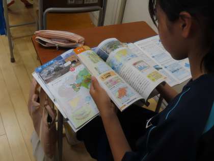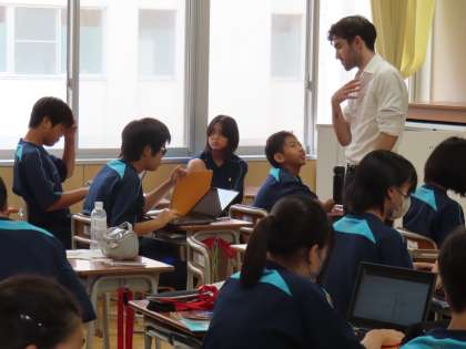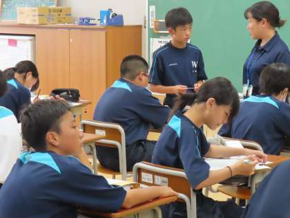 (写真下)2組英語「Let's make 3 hint quiz and enjoy it」