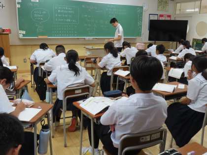 9月19日(木)1年生「授業の様子」 公開日 2024/09/19 更新日 2024/09/19 1年生 2時間目の授業は・・・ (写真上)1組数学「方程式の計算」 (写真中) 〃 (写真下)2組保体「バレーボール」