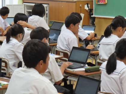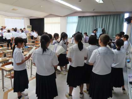 9月21日(土)1年生「授業の様子」 公開日 2024/09/21 更新日 2024/09/21 1年生 3時間目は授業参観です。 (写真上)1組音楽「合唱 〜夏の日の贈り物〜」 (写真下)2組英語「過去形を使って、夏休みの思い出を作文しよう」